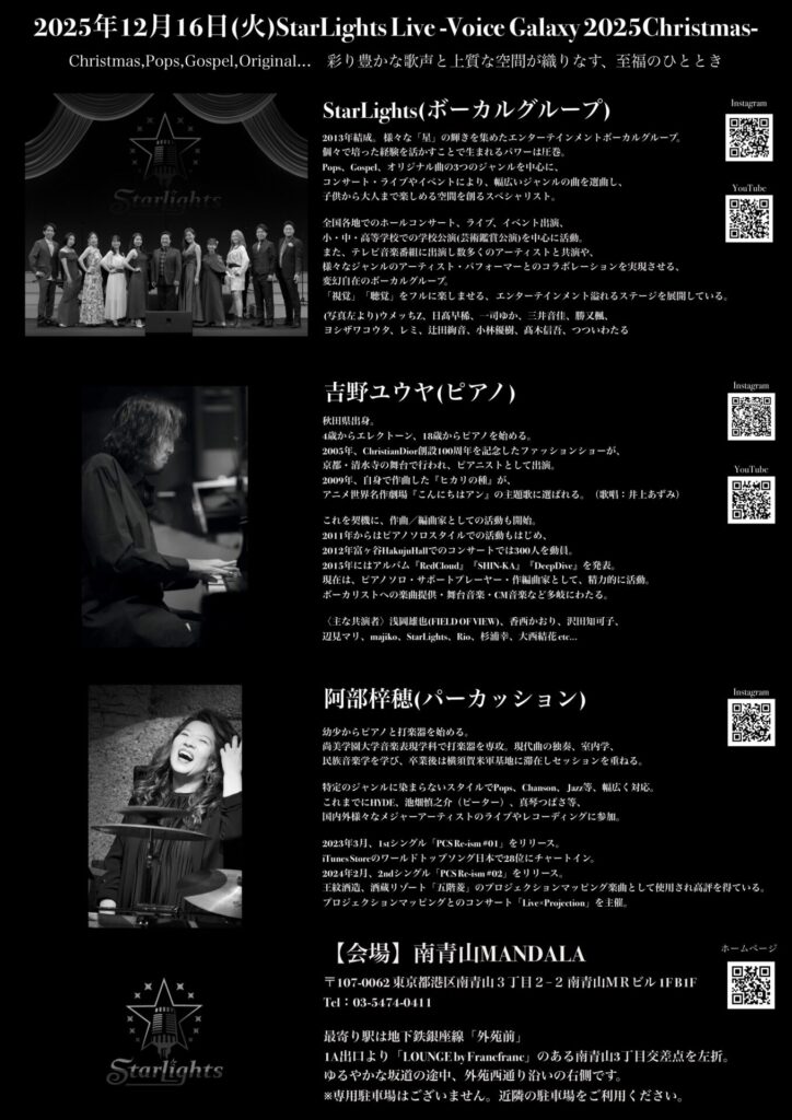 <StarLights Live -Voice Galaxy 2025 Christmas->StarLights(Vo Group) 吉野ユウヤ(Pf) 阿部梓穂(Per)開場18:30 開演19:30入場 ¥4000...